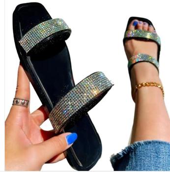 XS576 Nueva moda Arco Línea recta Diamante Rayas Zapatillas de fondo plano para sandalias de mujer al aire libre de moda Zapatillas