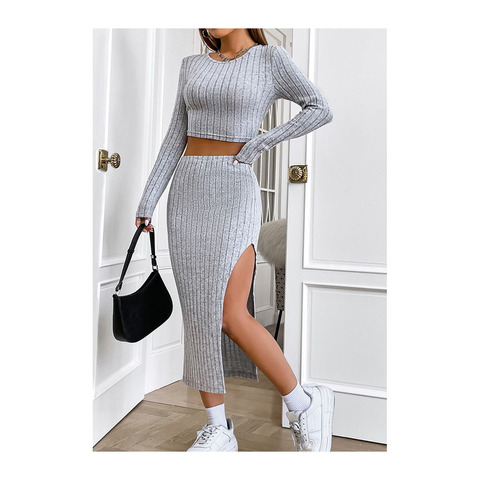 W3703 Hauts sexy en tricot pour femmes haut pull et robe longue fendue en tricot ensemble deux pièces taille haute vintage pull court vêtements pour femmes